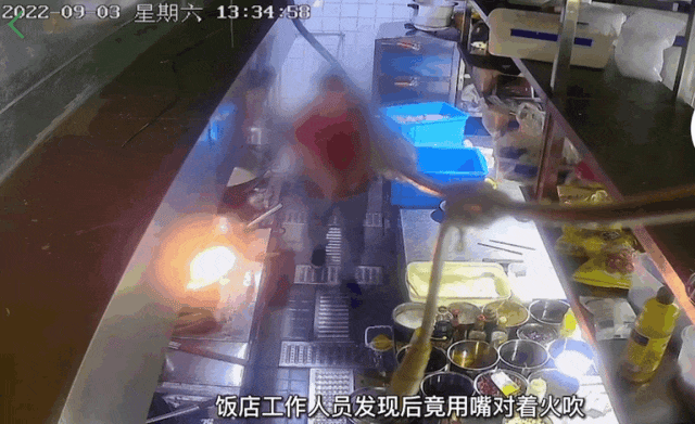 2022年9月3日,江苏南京一家饭店厨房内,无人看守的油锅突然起火,厨师发现后竟试图用嘴吹灭火,见效果不大,他又拿来锅盖盖住油锅,便去继续其他工作了,然而,数十秒后,油锅里的火未灭反而扩大了,厨师才意识到情况重,慌乱中拿来灭火器进行扑救,但由于火势越来越大,浓烟很快充斥了整个厨房。
