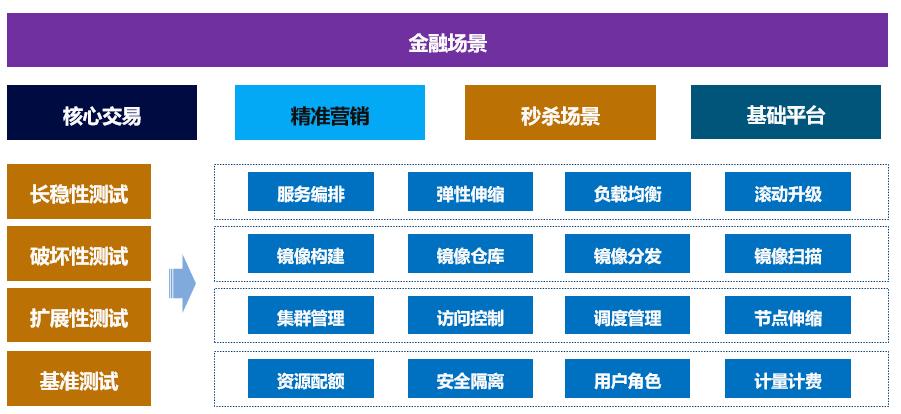 (三)面向金融场景的大规模容器平台性能评估业内首个基于行业场景的系统化大规模容器集群评估,模拟三个金融真实场景:核心交易、精准营销、秒杀,全面评估容器云平台承载真实业务负载的综合性能表现,包括业务指标和容器平台性能指标。业内首款测评工具,金融业务一键式部署评测结果自动生成。凝聚金融与云服务行业头部力量,制定面向金融机构、私有云服务商、公有云服务商的三套差异化评估方案与评级基准。