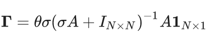代表的是一个向量,它包含了网络中每个节点的DomiRank值,记录了社交圈中每个人的受欢迎程度或影响力。A是网络的邻接矩阵,表示节点之间的连接关系,是一个记录谁与谁是朋友的社交网络图。IN×N是一个单位矩阵,它的大小与网络中节点的数量相同,可以想象成一个基准线,确保我们在评估每个人的受欢迎程度时不会偏离太远。θ是一个常数,用于调整 DomiRank 值的规模。