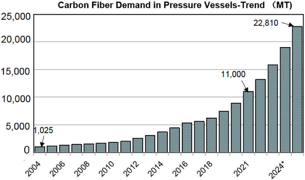 图11. 2004年至2024年全球汽车行业对碳纤维的需求。压力容器
