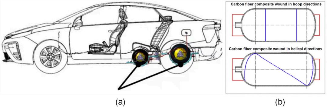 由于车辆空间有限,需要增加氢气的能量存储密度以及罐压,以提供更长的续驶里程。燃料电池汽车中复合材料压力罐的安装示意图如图13a所示,用于罐制造的纤维缠绕如图13b所示。
