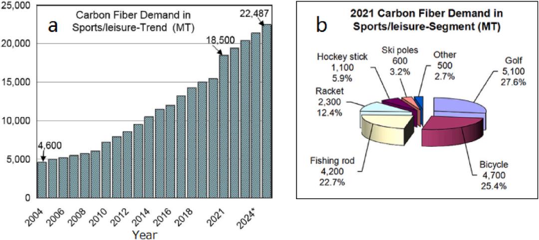 体育和休闲是最先成功使用碳纤维复合材料的行业。由碳纤维制成的主要产品是高尔夫球杆、钓鱼竿和网球拍。最近的趋势表明自行车使用的应用正在迅速扩大。自2010年以来,全球碳纤维在运动休闲装备中的使用呈稳步增长趋势(图14a)。2021 年,体育运动中使用的碳纤维数量达到了令人印象深刻的 18.5 吨。高尔夫球杆/杆和自行车是碳纤维的最大消费领域,分别占总消费量的27.6%和25.4%(图14b)。受疫情影响,曲棍球杆等团队运动装备的需求大幅下降,但高尔夫球杆、自行车、钓鱼竿等个人运动装备的需求却有所增加。因此,预计未来几年(2021年之后)碳纤维消费趋势仍呈增长趋势。随着可持续交通的倡导,电动自行车对碳纤维的使用需求也不断增加。