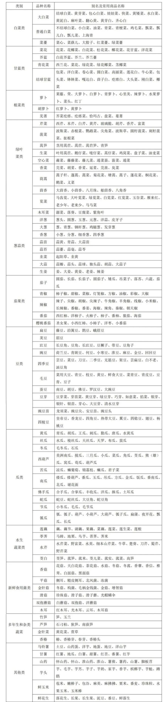 蔬菜别名及常用商品名称对照表