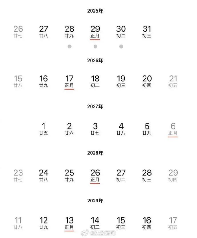 农历龙年的除夕为2024年2月9日,这可是“近几年最后一个年三十”。因为从2025年开始直到2029年,连续五年的除夕都是“大年二十九”。