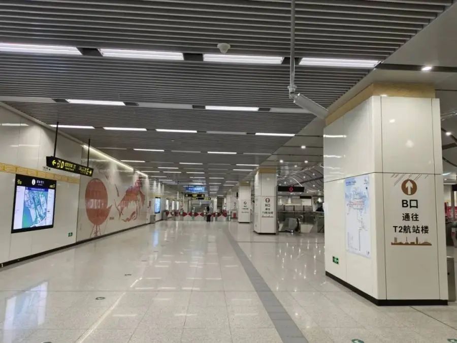 赶飞机的乘客,乘坐地铁到达新郑机场站后,通过B口通道出站即可直接到达T2航站楼负二层。