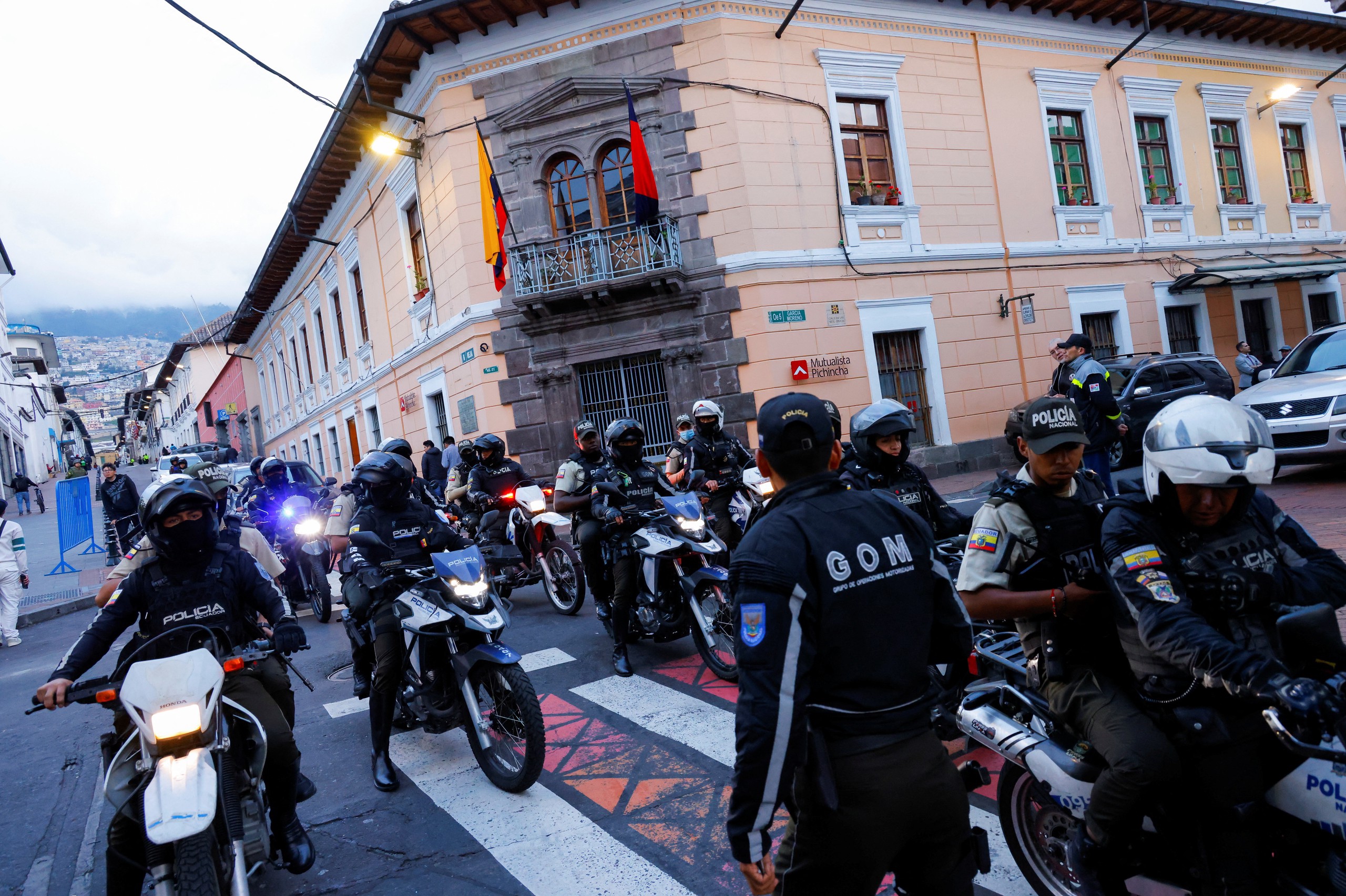 当地时间2024年1月9日,厄瓜多尔基多,暴力事件不断升级,厄瓜多尔总统诺沃亚签署行政法令,宣布全国进入“内部武装冲突”状态。图为警方加强巡逻。IC photo 图