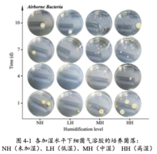 3.3种常用加湿用水中,自来水中微生物繁殖最缓慢,蒸馏水次之,凉白开最多,连续加湿时水箱内细菌呈指数增长,分析表明,加湿空气中与中高加湿水平(RH>55%)室内灰尘中细菌浓度与水中细菌浓度成正相关,且加湿后空气中与水中细菌群落具有很高相似性。