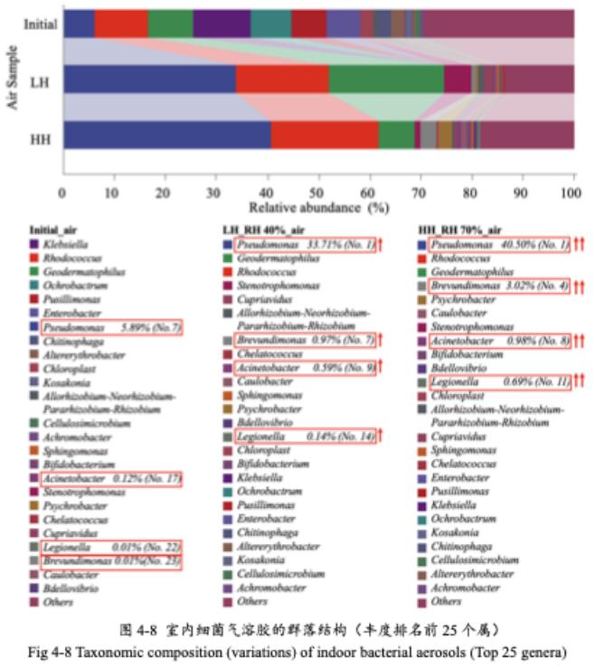 2.加湿后细菌气溶胶群落变化显著:群落结构转变为以致病菌属主导,并以假单胞菌属为主(RA=40.50%),短波单胞菌属(RA=3.02%),不动杆菌属 (RA=0.98%)和军团菌(RA=0.69%)等具有致病风险的菌丰度均增大。