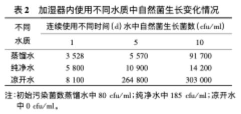 对于不同湿化用水,不管是蒸馏水、饮水机中取用的饮用纯净水还是凉开水,连续使用1d以后,其水中菌数明显增加。即使初始菌数很低的凉开水,使用一天后, 水中生长菌数较蒸馏水和纯净水都高,达8100cfu/ ml。