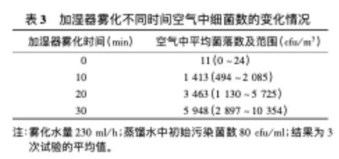 将连续使用状态下的超声波加湿器雾化水量调节至 230 ml/h,在气雾室温度18°C -18.5°C,相对湿度加湿前36% -57% 条件下,检测结果表明,随着雾化加湿的时间的延长,空气中污染菌数明显增加;雾化10 min 后空气中平均污染菌数从加湿前的11 cfu/ m⊃3;,增加至1413 cfu/m⊃3;,雾化30 min 后空气中平均污染菌数高达59481 cfu/m⊃3;。
