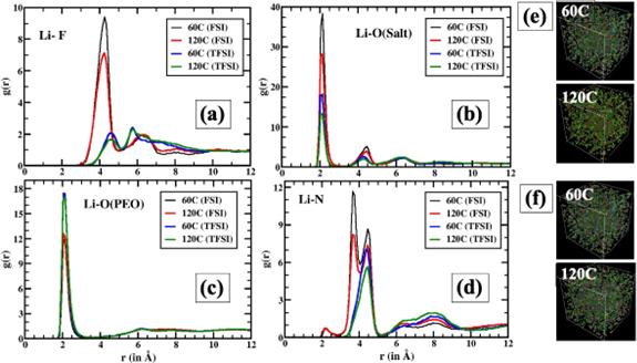 Figure 5. Structural behavior of Li+ ions. Radial distribution function (RDF) of Li+ with respect to (a) fluorine, (b-c) oxygen of salt and oxygen of PEO at two different temperatures, 60 ºC and 120 ºC. (d) Li+ with nitrogen atoms of salt. (e) and (f) snapshots showing LiFSI and LiTFSI respectively. For clarity only Li+ and Li+ salts are shown.4.作者使用介电弛豫光谱研究了强束缚和高流动性 Li+ 的动力学。Al-LLZO 片晶的掺入增加了更易移动的 Li+ 的数量密度。