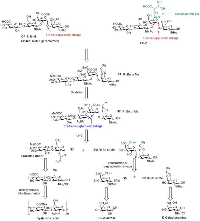 针对以上问题,北京大学药学院李中军团队提出了一种基于解聚透明质酸聚糖的半合成策略(图2)。作者首先观察到,该荚膜四糖的非还原端二糖为透明质酸聚糖的二糖重复单元,通过对透明质酸聚糖采用特定条件酸解的方式,可简单高效获得均一的透明质酸二糖结构,在实验室中可实现十克级别规模以上的制备。还原端二糖则采用传统的砌块合成方法,为实现1,2-cis-糖苷键的构建,采用了N,N-二甲基甲酰胺溶剂控制与6-O-乙酰丙酰基远程参与的双重策略。[2+2]糖基化反应则使用了高活性的三氟噁唑啉作为供体,以90%的糖基化效率完成了β-氨基糖糖苷键的构建,该方法实现更高反应收率的同时,糖基化供体也表现出更高的稳定性。