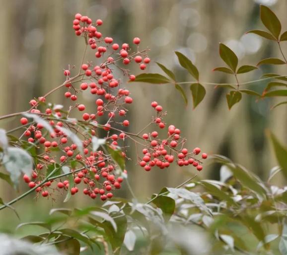 南天竹,又称红杷子、天烛子、红枸子、天竹等,由于其植株优美,果实鲜艳,对环境的适应性强,常常出现在园林应用中,被种植于山石旁、庭屋前或墙角阴处,为赏叶、观果的优良树种。