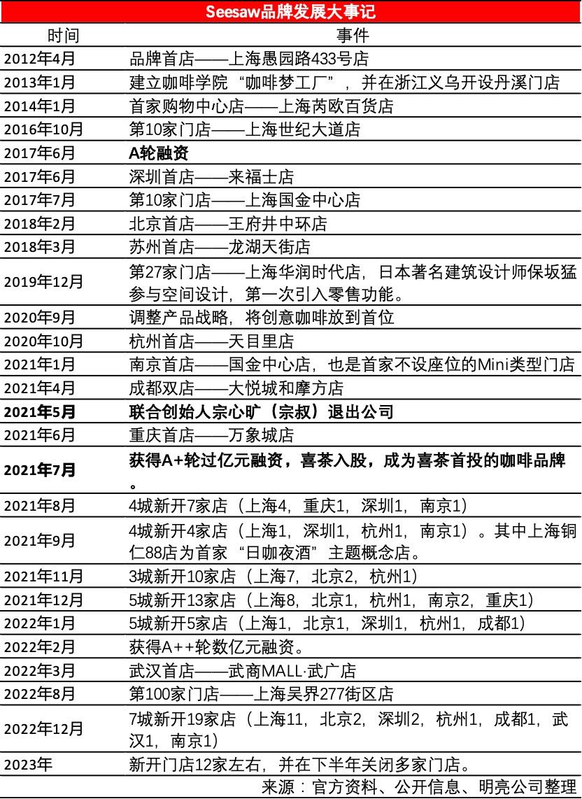 然而,Seesaw作为其中成立最久的品牌,作为精品咖啡连锁最早获得融资的品牌,却在2023年进入收缩期,接近年底,关闭了北京、上海、重庆、武汉、杭州的部分门店。