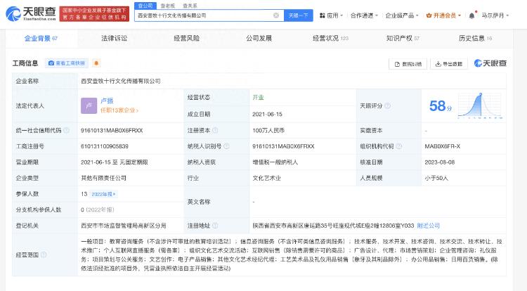 相关工商资料显示,“程前朋友圈”关联公司西安壹牧十行文化传播有限公司成立于2021年6月,法定代表人为卢振,注册资本100万元人民币,经营范围含个人互联网直播服务、市场营销策划等,由杭州无限游戏有限公司、杭州从心出发传媒有限公司、南昌轩指文化传媒有限公司共同持股。2022年该公司共13人参保。对外投资信息显示,该公司直接持股12家企业,其中6家为存续状态,包括杭州程前朋友圈企业管理有限公司(大号“程前朋友圈”的认证公司)、杭州壹牧十行企业管理有限公司、杭州程前文化传媒有限公司等。