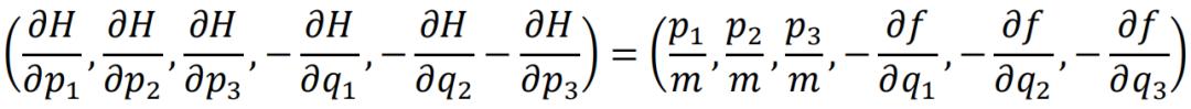 如果我们把(q1, q2, q3)理解为质量为 m 的质点的位置,(p1, p2, p3)为质点的动量,那么XH的积分曲线正是质点在势能场f(q)中的运动,这便是哈密顿力学。此处的哈密顿函数H就是质点的总能量。