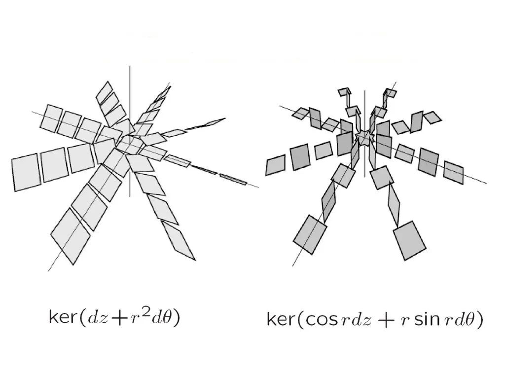 在执行手术前,通过扰动我们可以要求对象纽结会横截地穿过切触平面,比如上图左侧的 z 轴(我们可以把z轴的±∞附近的切触结构粘合起来)。如果把这个首尾相粘的z-轴的小邻域去掉,那么在边界轮胎面上,切触结构和轮胎面的切空间会交出一个斜率很小的切向量,这被称为特征叶状结构——我们可以把它想象成螺丝上的螺纹。那么在缝合的时候,我们需要将由两侧切触结构诱导的螺纹对齐。不过因为缝合方式的不同,从新粘入的实心轮胎一侧看,这个相应的螺纹可能会有完全不同的斜率。也就是说,我们需要一个具有切触结构的实心轮胎,使得其边界上的螺纹具有任意的斜率。在上图左侧的情形(通过一个坐标变换,它等价于前文的标准切触结构)为例,通过增大以z-轴为轴心的半径,我们能实现越来越多的斜率,但始终无法实现所有的斜率,因为沿着径向切触平面只旋转了半圈。与标准切触结构不同的是,上图右侧的切触结构(被称为过度扭转(overtwisted)切触结构),由于切触平面沿着径向不停地旋转,我们的确可以通过选择合适的半径实现所有的斜率。所以,通过在过度扭转切触空间中选取合适的手术配件,我们就可以在任何手术上实现切触结构。