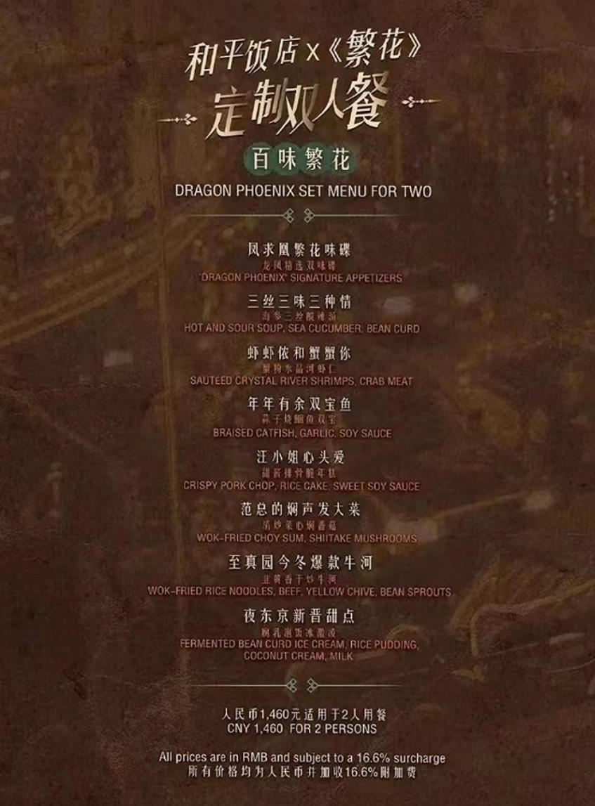 黄河路的苔圣园,也是剧里至真园的原型丨拍摄 He《繁花》虽然讲商战、讲沪上过往,但里面的美食却并未沦为背景板,反而看起来相当诱人。借着剧集的东风,不少店铺都开始复刻“繁花套餐”,上海和平饭店就推出了价值1460元的双人套餐,每天仅限20套,已经有不少粉丝抢先打卡了。