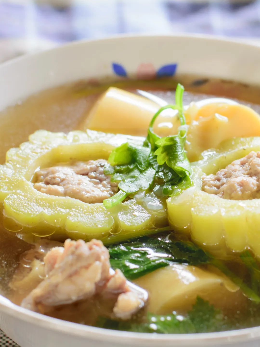 将苦瓜与狮子头同煮,苦瓜也不辜负“君子菜”的美名。它清苦自甘,绝不将苦味附着于它物之上,但一抹鲜味却久久流传。