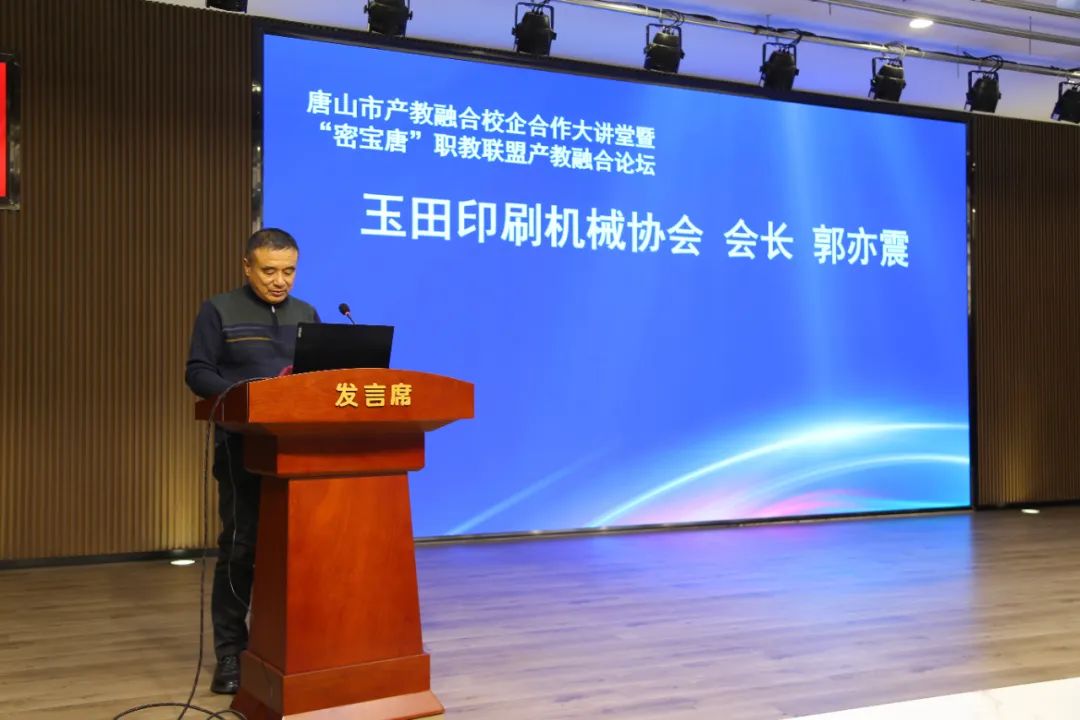 唐山瑞阔自动化设备有限公司首席执行官王智明发言在玉田职教中心智能制造产业学院揭牌仪式中,智能制造产业学院副理事长、玉田县管道协会会长商震先生宣读了理事会名单;唐山市教育局党组书记、局长史林友,玉田县政府副县长付雪松共同为产业学院揭牌;学院建设指导委员会、理事会代表单位,北京印刷学院机械学院印刷工程系主任廉玉生博士、玉田印刷机械协会会长郭亦震、唐山海泰新能科技股份有限公司副总裁吕井成进行了发言。