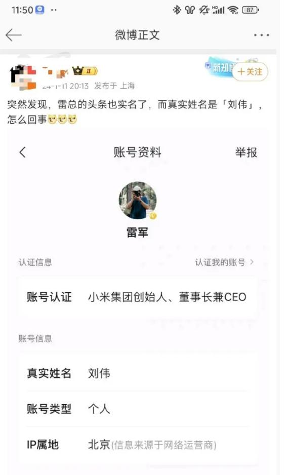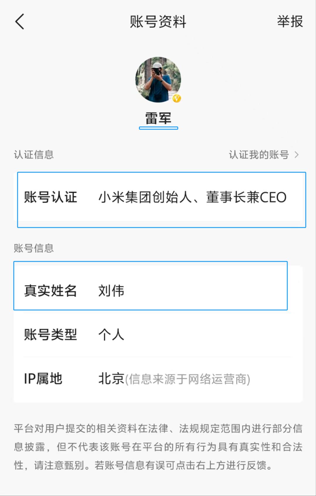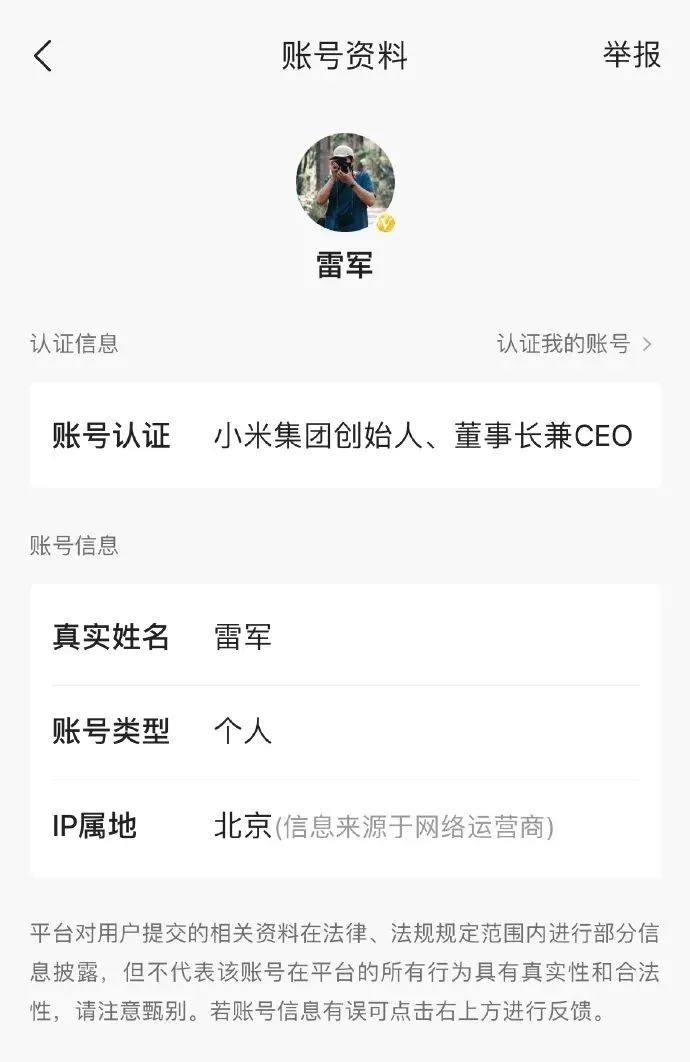 随着“前台实名制”的落实,今日头条APP、新浪微博等已可查看部分大V的真实姓名,其中,小米集团创始人、董事长兼CEO雷军的账号引起了关注。
