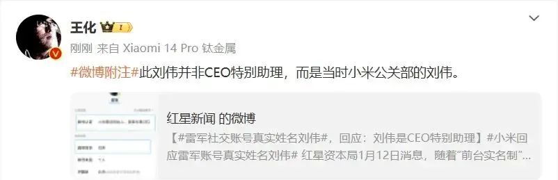 截图自新浪微博有媒体发文称刘伟是小米集团CEO特别助理,小米集团公关部总经理王化随后辟谣:“此刘伟并非CEO特别助理,而是当时小米公关部的刘伟。”