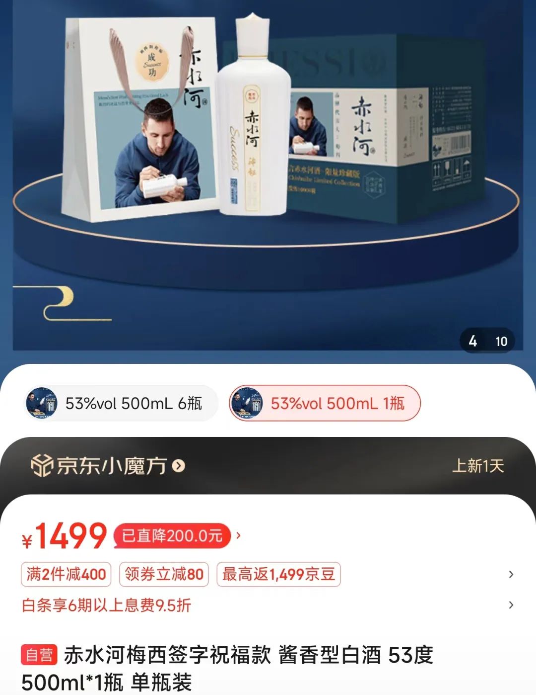 ▲(截自赤水河京东自营店)2023年8月1日,梅西在社交平台宣布成为赤水河酒的品牌代言人。当时,很多人觉得难以置信:“梅西肯定还不知道”“梅西被骗了吧”……8月2日,赤水河酒就举办了品牌发布会,官宣了梅西代言一事,穿着10号球衣的高进华,出席了会议。