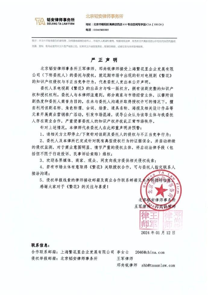 1月12日,《繁花》电视剧针对近期市场中出现的知识产权侵权与不正当竞争行为在官博发布声明,要求相关方立即停止/下架针对该剧及委托人的侵权与不正当竞争行为,并表示若市场主体有意取得《繁花》关联授权合作,须与指定联系人接洽沟通。