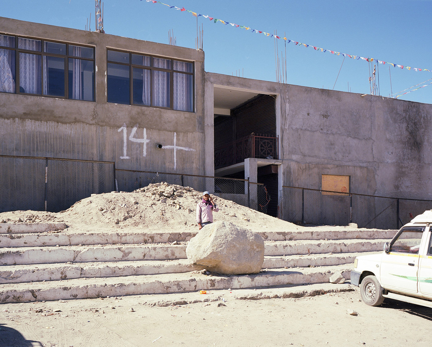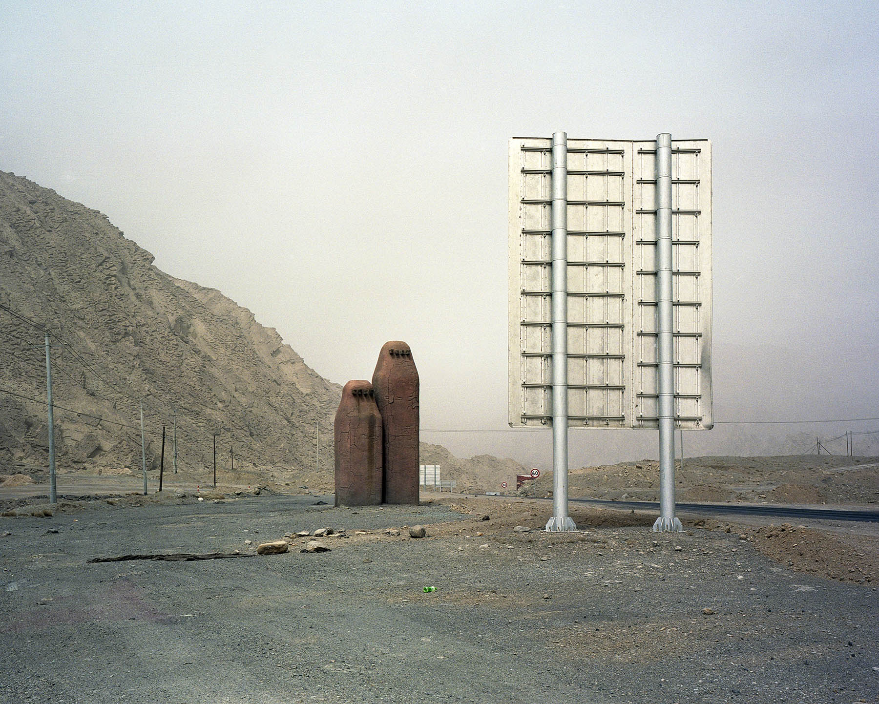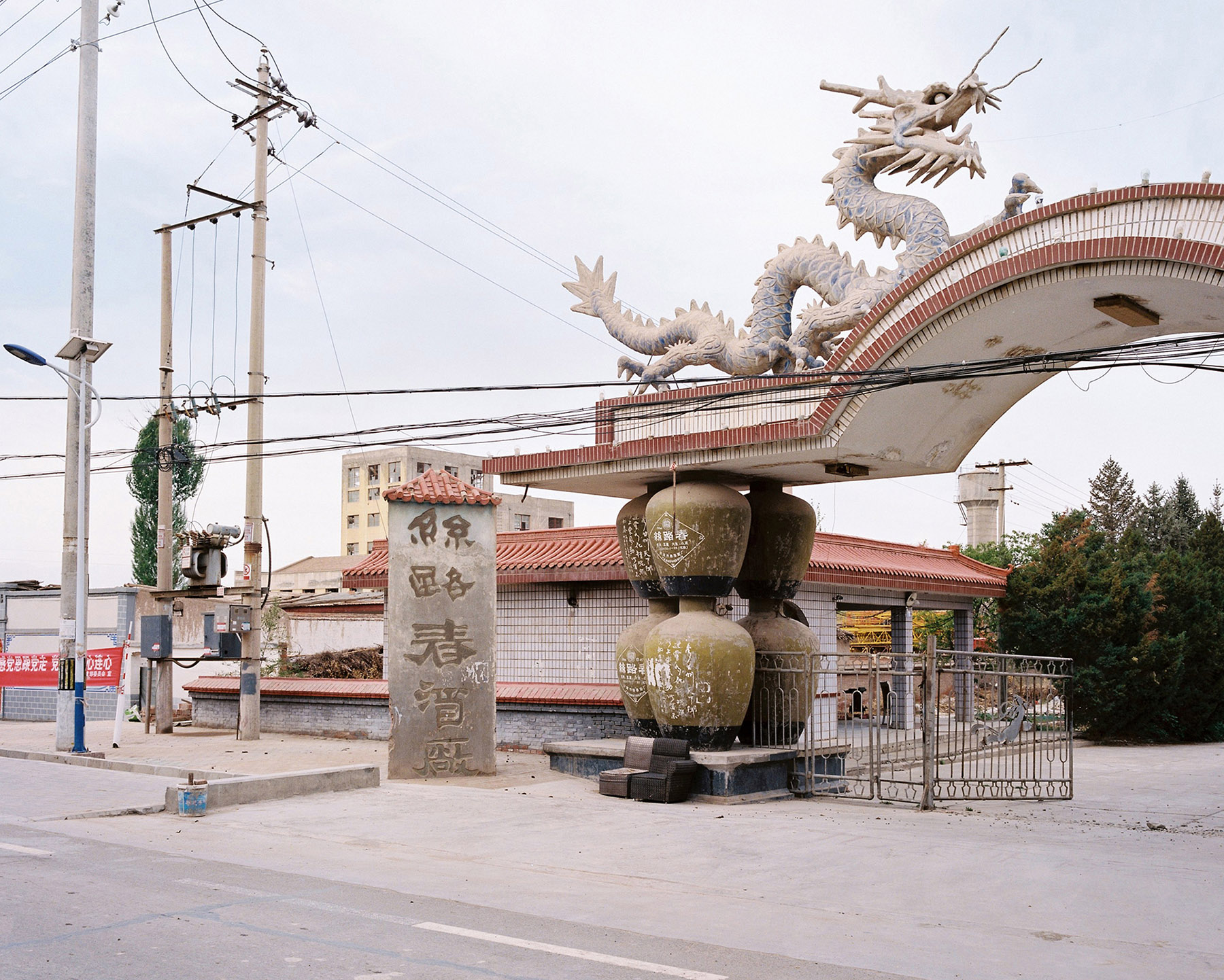 展览中的一张照片(下图2)里,施泰因格用中画幅相机对准一处看似是酒厂大门的地方,几枚酒缸撑起了顶头的龙形雕塑,石碑上的“丝路”和铁门上的飞天装饰提示照片在中国西部的甘肃地区所拍。“我是被大门前的两把椅子所吸引的,想象人们随意地坐在上面休憩,它们的存在与周边的环境有些矛盾冲突。”施泰因格说,“它似乎在某个侧面象征中国的发展速度,是一扇观看社会的窗户。照片不仅是美学层面上的,还有一些静态的信息,代表了我的观察和反思。两者兼而有之。”