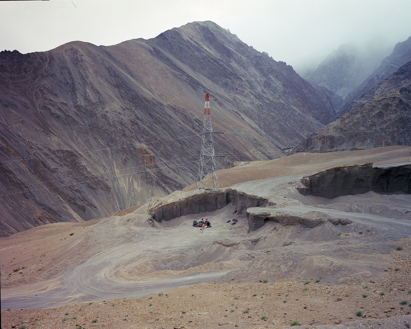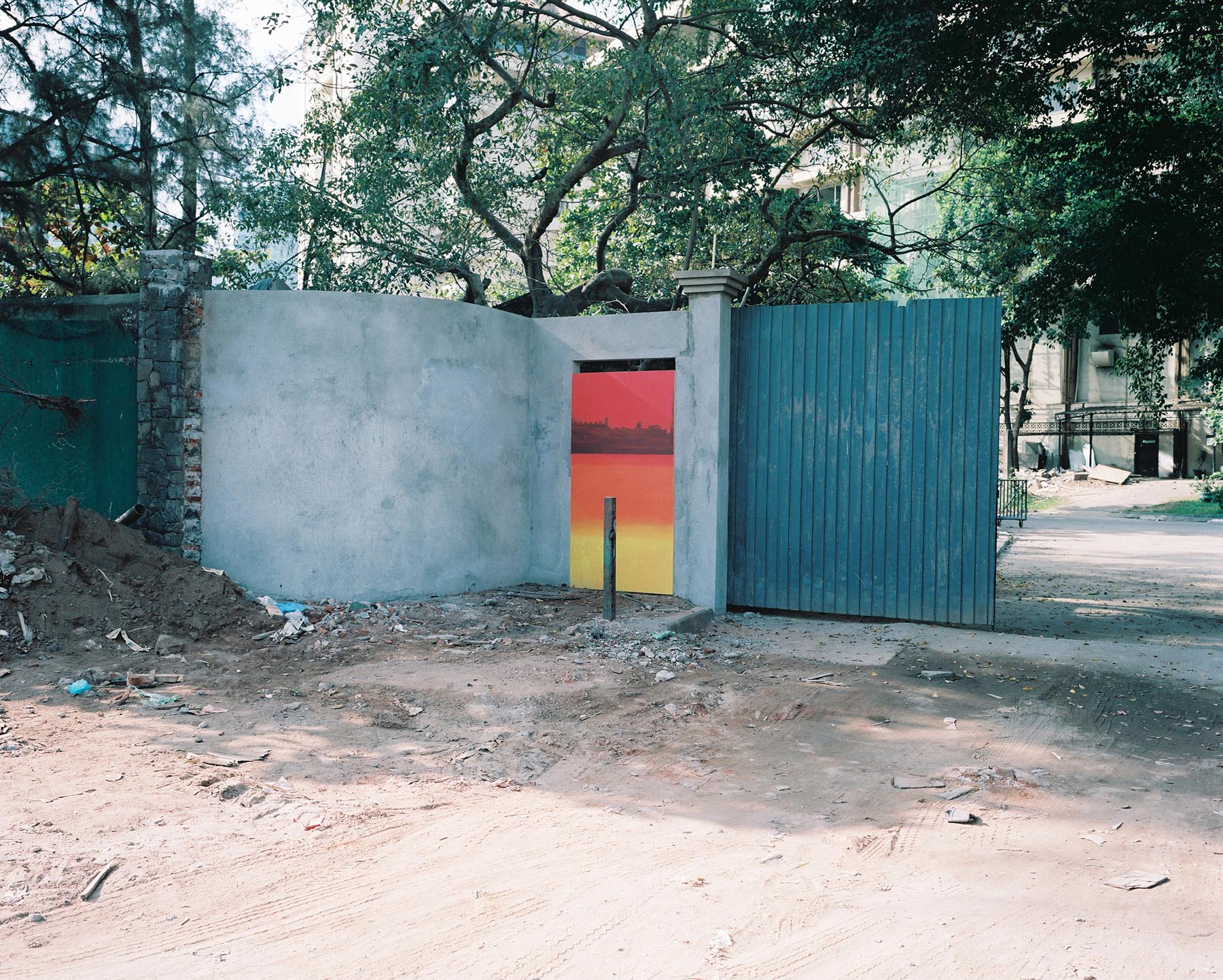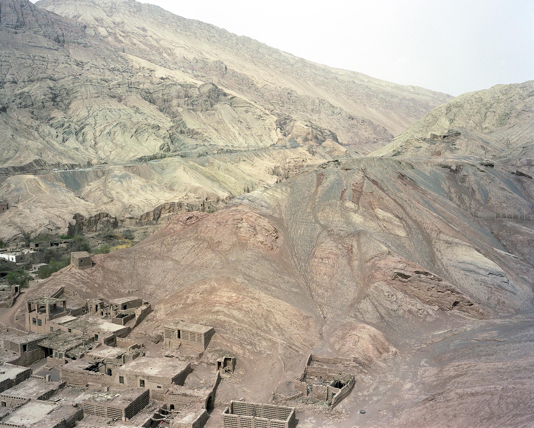展览中的一张照片(下图2)里,施泰因格用中画幅相机对准一处看似是酒厂大门的地方,几枚酒缸撑起了顶头的龙形雕塑,石碑上的“丝路”和铁门上的飞天装饰提示照片在中国西部的甘肃地区所拍。“我是被大门前的两把椅子所吸引的,想象人们随意地坐在上面休憩,它们的存在与周边的环境有些矛盾冲突。”施泰因格说,“它似乎在某个侧面象征中国的发展速度,是一扇观看社会的窗户。照片不仅是美学层面上的,还有一些静态的信息,代表了我的观察和反思。两者兼而有之。”