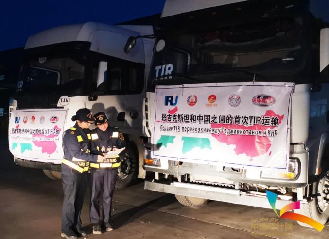 1月12日,两辆悬挂有TIR标识牌的运输车辆满载进口货物抵达喀什综合保税区,在喀什海关关员验核单证和封志后办结通关手续。这是全国首票自塔吉克斯坦进境的TIR货物。