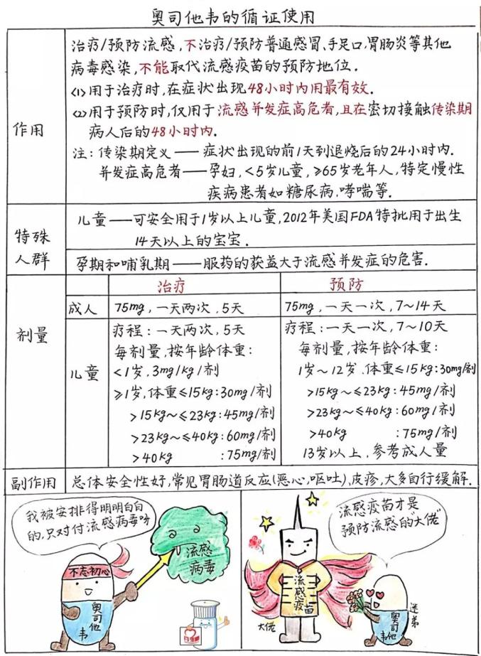 关于奥司他韦的循证使用,我曾经提炼出一个表格,并请问药师团队的郭琳药师手绘了一份图表,下面分享给大家。