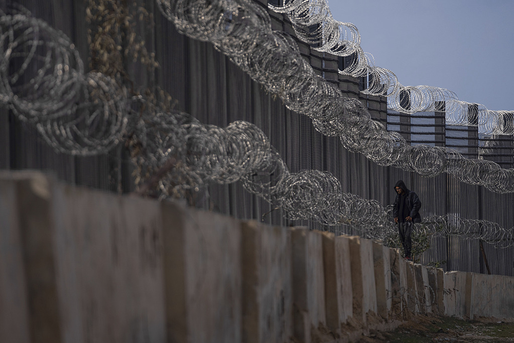 当地时间2024年1月14日,加沙南部拉法,一名因以色列轰炸加沙地带而流离失所的巴勒斯坦人沿着与埃及的边界行走。