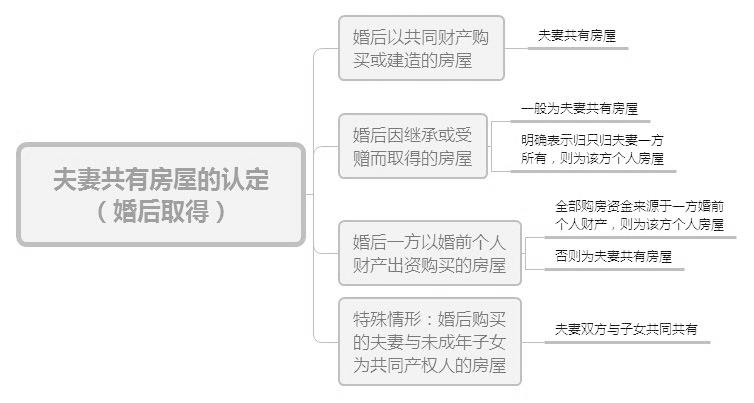 2.婚后取得的房屋在对夫妻婚后取得的房屋性质进行认定时,首先要适用法定的夫妻婚后所得共同制原则,即婚姻关系存续期间夫或妻一方或双方所得的财产均属于夫妻共同财产;其次再依照例外情形来认定是否为夫或妻一方所有。