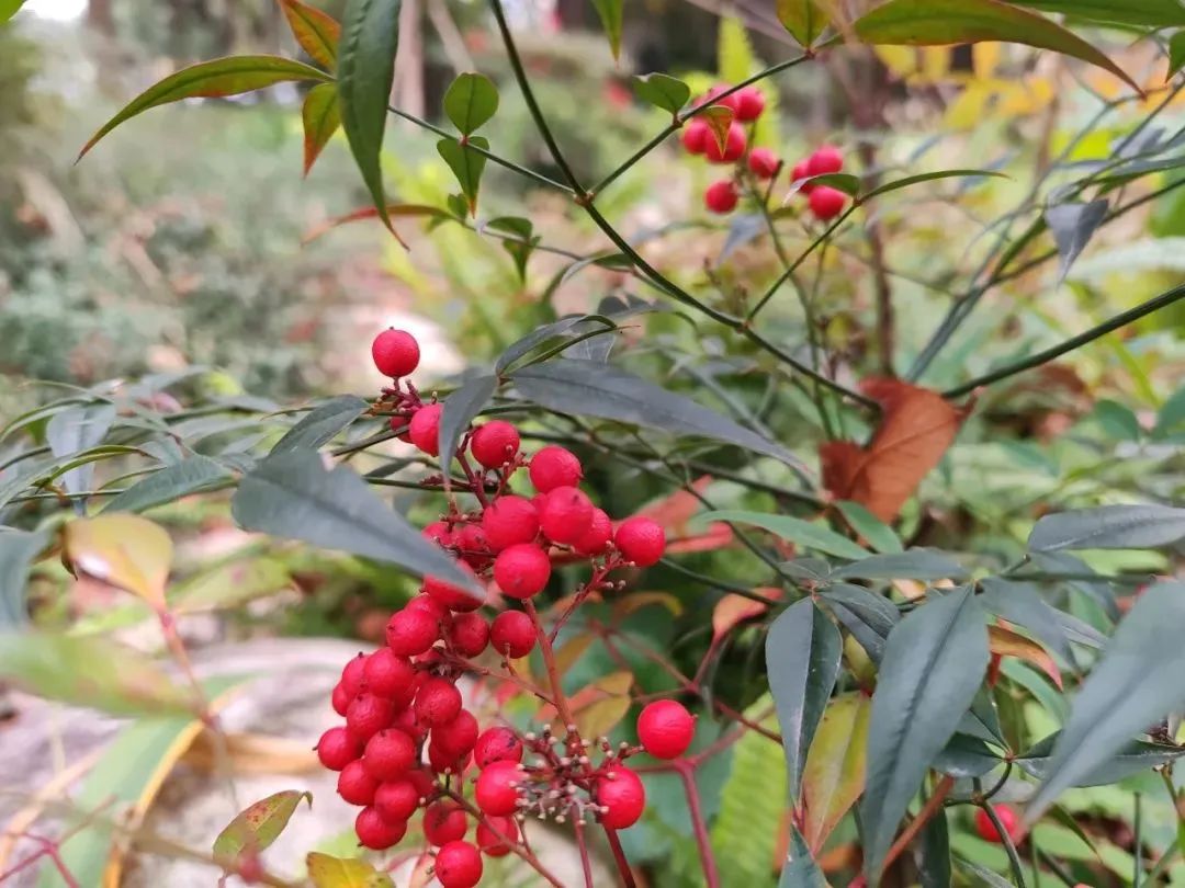 在中山公园和"融·生境花园"里,生长着几处艳丽秀气的南天竹。一丛丛绿叶中,如珊瑚般光泽鲜亮的鲜红果实尤为突出;同时,南天竹的部分叶片也会在秋冬季渐变为红色,层次丰富,极具观赏价值。