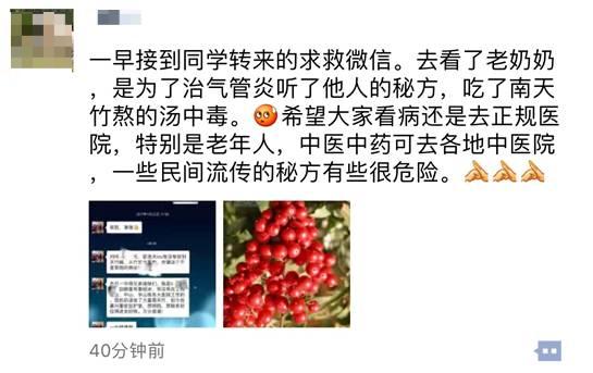 一位浙江嘉兴的老太太,为了治支气管炎听了他人的秘方,吃了南天竹的汤中毒,心律失常严重,连夜住进了重症监护室。