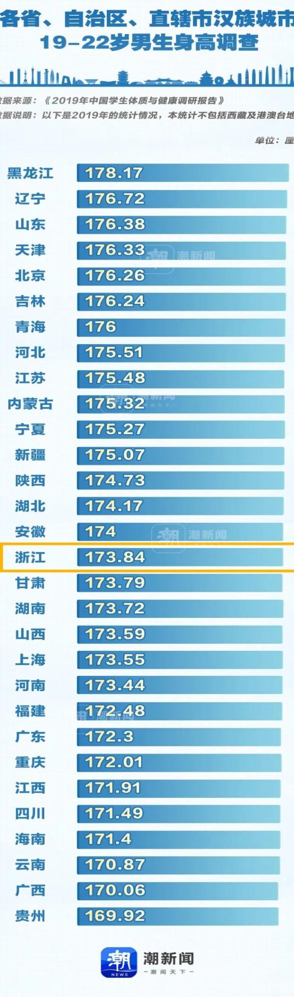 根据2022年出版的《2019年中国学生体质与健康调研报告》显示:19-22岁男生中,黑龙江省以178.17厘米的平均身高位居榜首,辽宁省以176.72厘米的平均身高紧随其后,而山东省则以176.38厘米位列第三,均在175厘米以上。