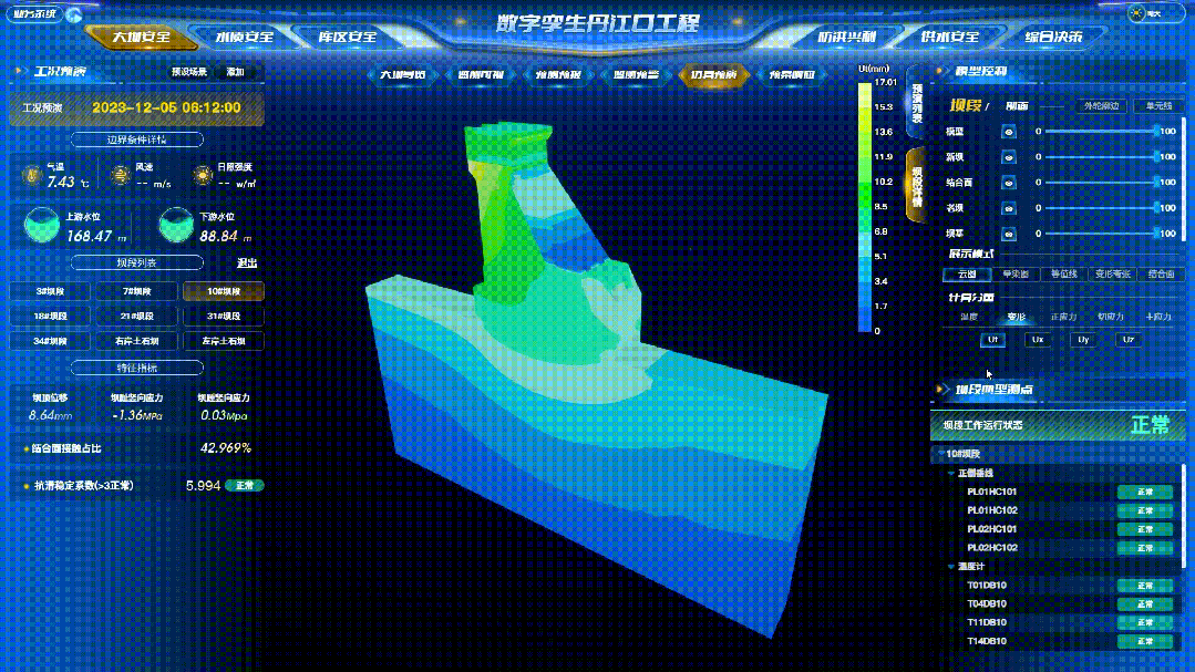 重点坝段有限元仿真计算与安全性态分析与过去大坝安全性态演算需耗时数月进行海量计算相比,现在依靠自主研发的大坝性态仿真模块,不仅有效提升了大坝数字孪生映射的效率,还通过基于监测值局部样本和有限元极限工况仿真的两级预警指标阈值设定方法,有效提升了预警准确性和规范性。