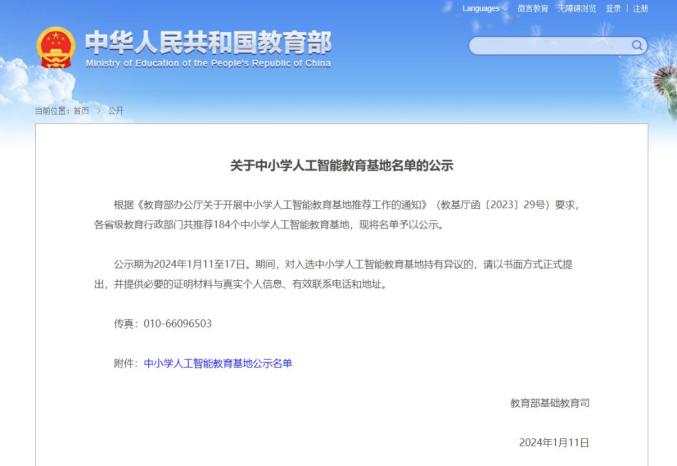 公示期为2024年1月11至17日。期间,对入选中小学人工智能教育基地持有异议的,请以书面方式正式提出,并提供必要的证明材料与真实个人信息、有效联系电话和地址。