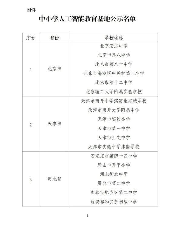 关于中小学人工智能教育基地名单的公示根据《教育部办公厅关于开展中小学人工智能教育基地推荐工作的通知》(教基厅函〔2023〕29号)要求,各省级教育行政部门共推荐184个中小学人工智能教育基地,现将名单予以公示。