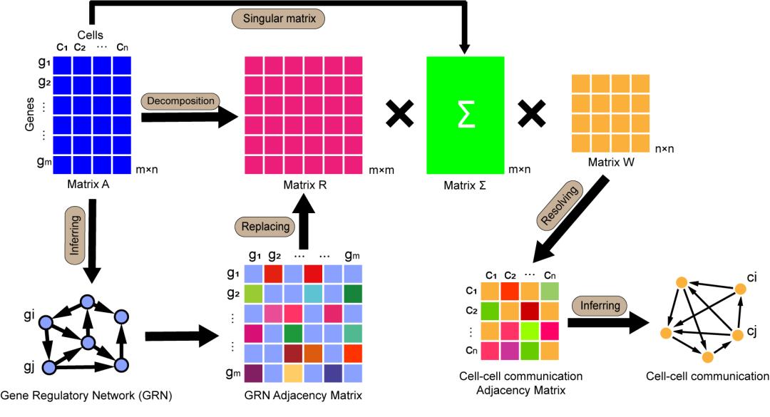 单细胞的基因表达通常由两条路径控制:一方面,基因可以被同一细胞中的其他上游基因或因子直接调控;另一方面,由于细胞会受到同一组织或器官中其他细胞的影响或调控,细胞中的基因表达将受到其他细胞的间接调控。由此说明,单细胞基因表达矩阵将包含两部分信息:基因之间的调控信息和细胞之间的调控信息。