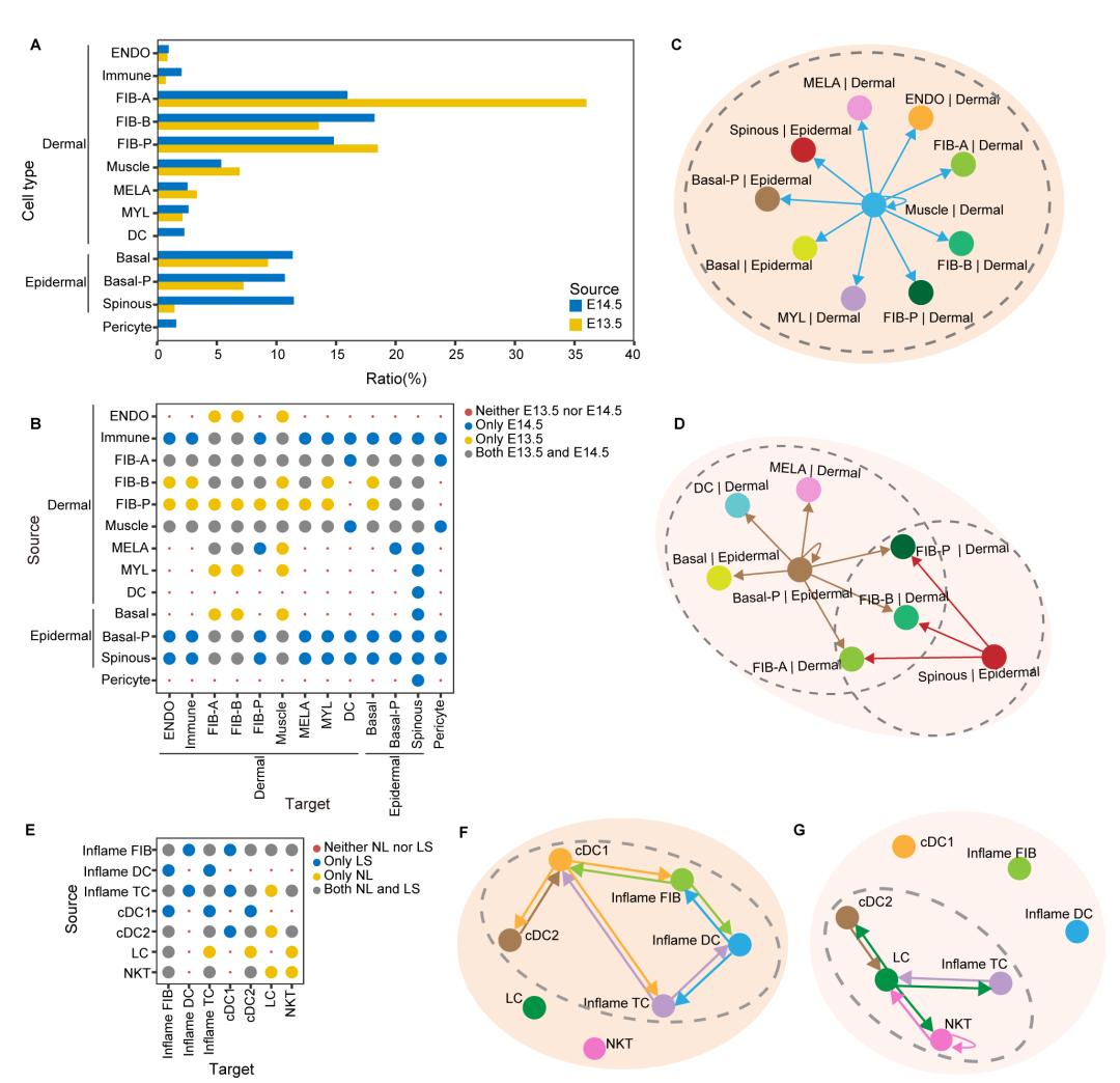 使用MDIC3算法进行联合分析,通过分析小鼠胚胎不同发育阶段的通讯网络,发现从E13.5到E14.5发育阶段,通讯信号的主导者由真皮细胞转变为表皮细胞;通过比较人类特异性皮炎不同疾病状态下的通讯网络,发现病变和非病变皮肤可能都会存在炎症现象,但炎症细胞之间的通讯在病变皮肤中更为活跃(图3)。