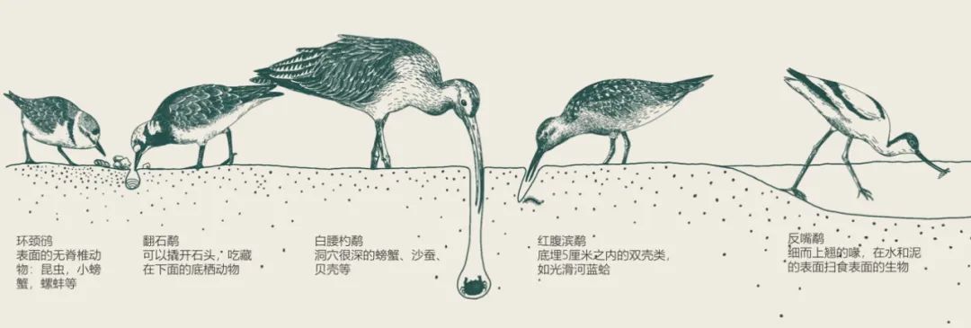不同的水鸟有不同的觅食行为和不同的食物偏好 ©WWF东南沿海的滩涂是很多迁徙水鸟的觅食地,也是蛏苗的养殖地(主要在福建和浙江)。作为全世界蛏子的最重要产地,据2015年的一项统计,中国年产蛏子80万吨。
