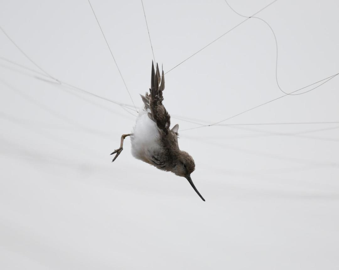 被防鸟网困住的翘嘴鹬,其是防鸟网中被捕捉的量较大的物种 ©梁丹“站在保护鸟类的角度讲,如果养殖户只是为了保护蛏苗,是不是可以在养殖结束后就进行拆除?至少降低对春季迁徙候鸟的威胁”,同样来自任鸟飞的曹志刚称。
