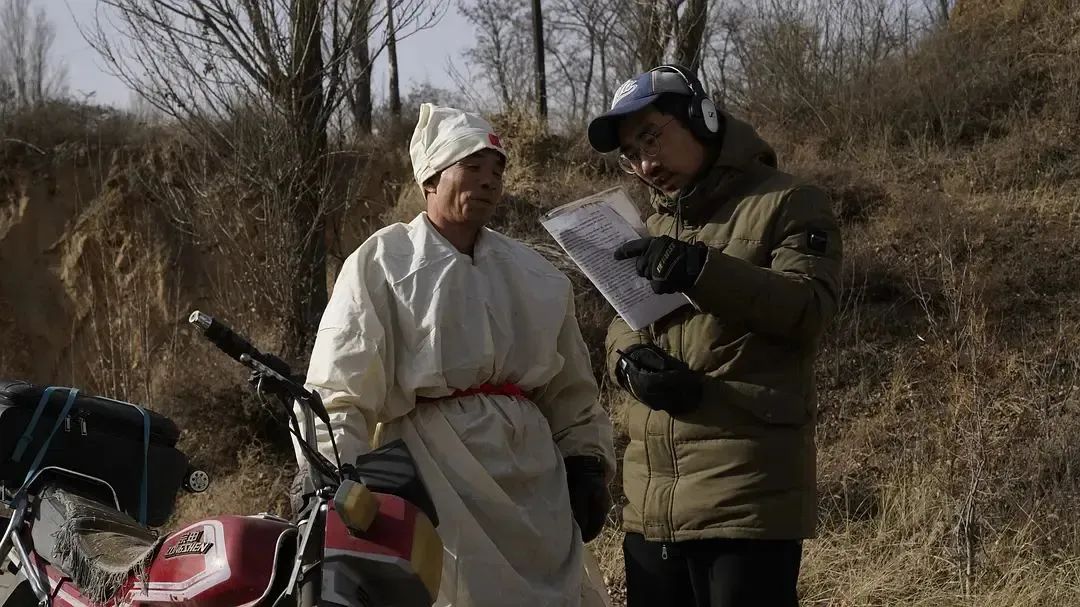 《夜幕将至》葬礼部分拍摄中我写这个剧本的时候,脑海里全部都是对应的画面。《夜幕将至》的场景对我而言十分熟悉,里面出现的几种交通工具都是我每次从北京回家要乘坐的。男主在回家路上经历的也都是我曾经经历过的——故乡的人对自己事业感情上的深深浅浅的试探,以及那些尴尬的,令人失语的时刻。