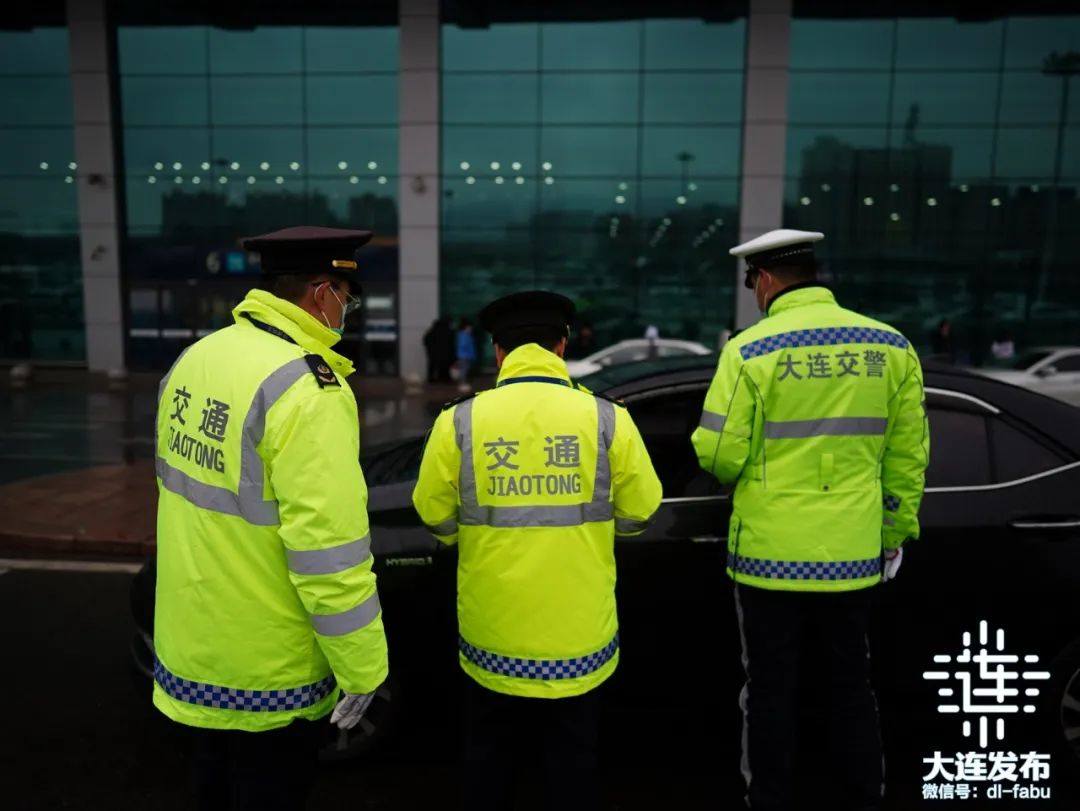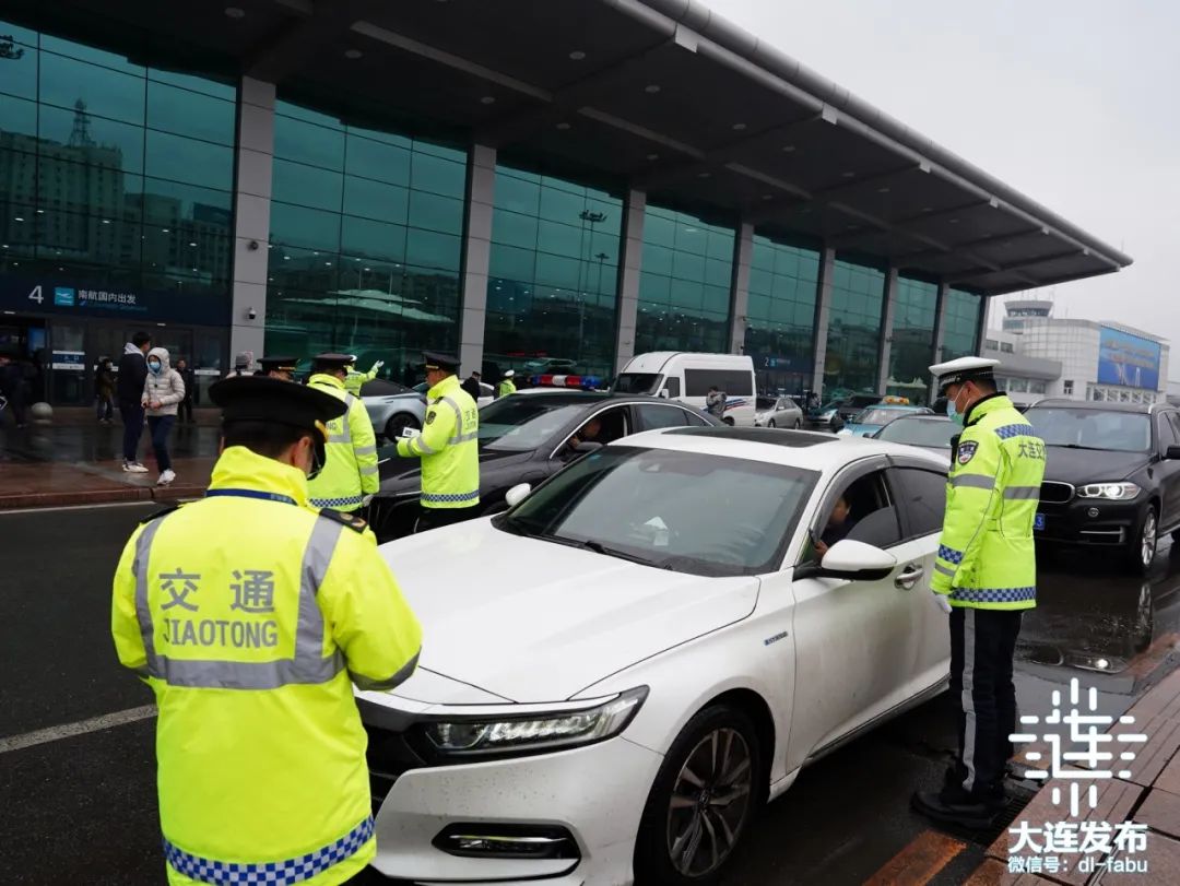 1月17日10:00,在大连国际机场二楼落客平台,执法人员正在设点对前来送客的网约车进行检查。