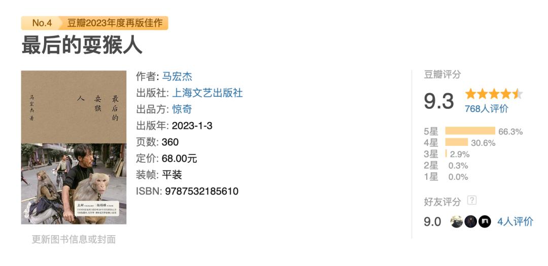 作者是特殊时期的受害者之一,本书描写了他在看守所和监狱内的真实经历,展现了一幅特殊的时代画卷。同样是描写特殊时期的书,比《二手时间》和《一百个人的十年》还是不如的,作者的文字是白描的,更像是叙述,没有很强烈的情感体现,总体显得平淡。但就是平淡的叙述更能让人感受到特殊时期的荒谬恐怖。在时代的背景下,芸芸众生更多的只是个人命运的被动接受者。本书的价值应该就是作者最后说的,希望后人能记住,希望后人不用重蹈覆辙。6. 《最后的耍猴人》——马宏杰