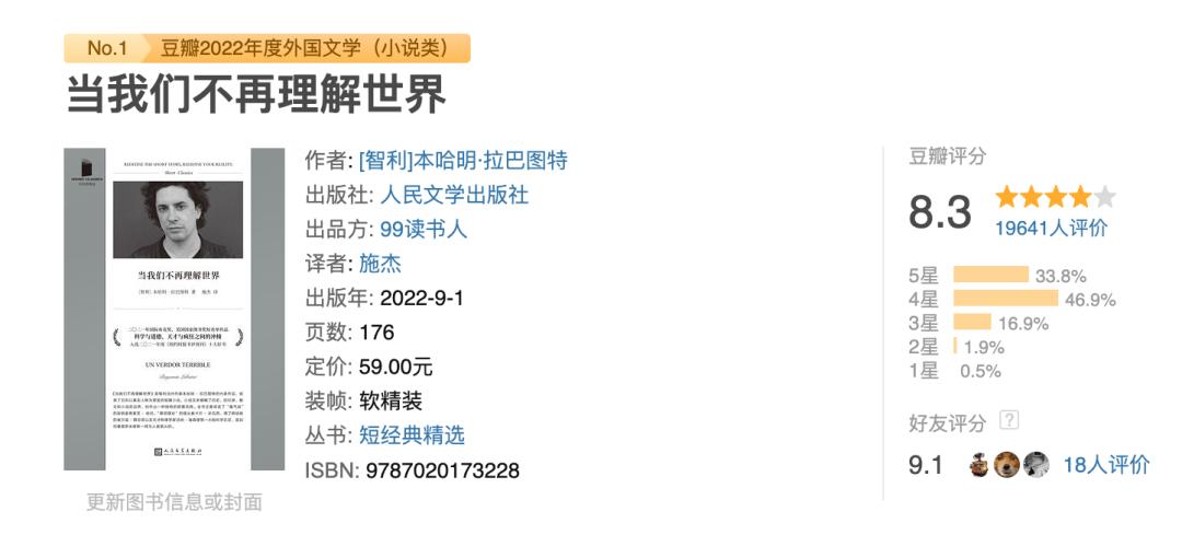 尤瓦尔在《未来简史》的序言里举过一个例子:东南亚的制造业很发达,但是在工业自动化的背景下,越来越多的工人被机器取代,而失业的工人去哪儿了?没人知道,没人关注。耍猴人也是这样一群个体,不过他们消失得更早些。在马宏杰的书里,记述的时间跨度很长,我们可以看到中国最后一批耍猴人在历史的进程中与生活搏斗但最终消失的过程。他们可悲吗?很可悲。但是这确实就是时代进步的必然代价。这本书的价值就在于,提醒我们,在享受时代进步带来的幸福同时,曾有一些人是这一切的代价。引申来说,每一次选择,都会有一部分人成为代价。记住这些代价,才能让我们每一次的选择变得慎重。7. 《当我们不再理解世界》——本哈明·拉巴图特