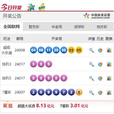 1月17日,中国体彩第24017期排列3和排列5开奖,出现了罕见的“连五”组合,体彩排列3的开奖号码为豹子号码“555”,排列5的开奖号码为“55555”。本期排列5一等奖中奖注数为5966注,单注奖金为84034元,应派奖金合计501,346,844元,公告显示奖池被清空。