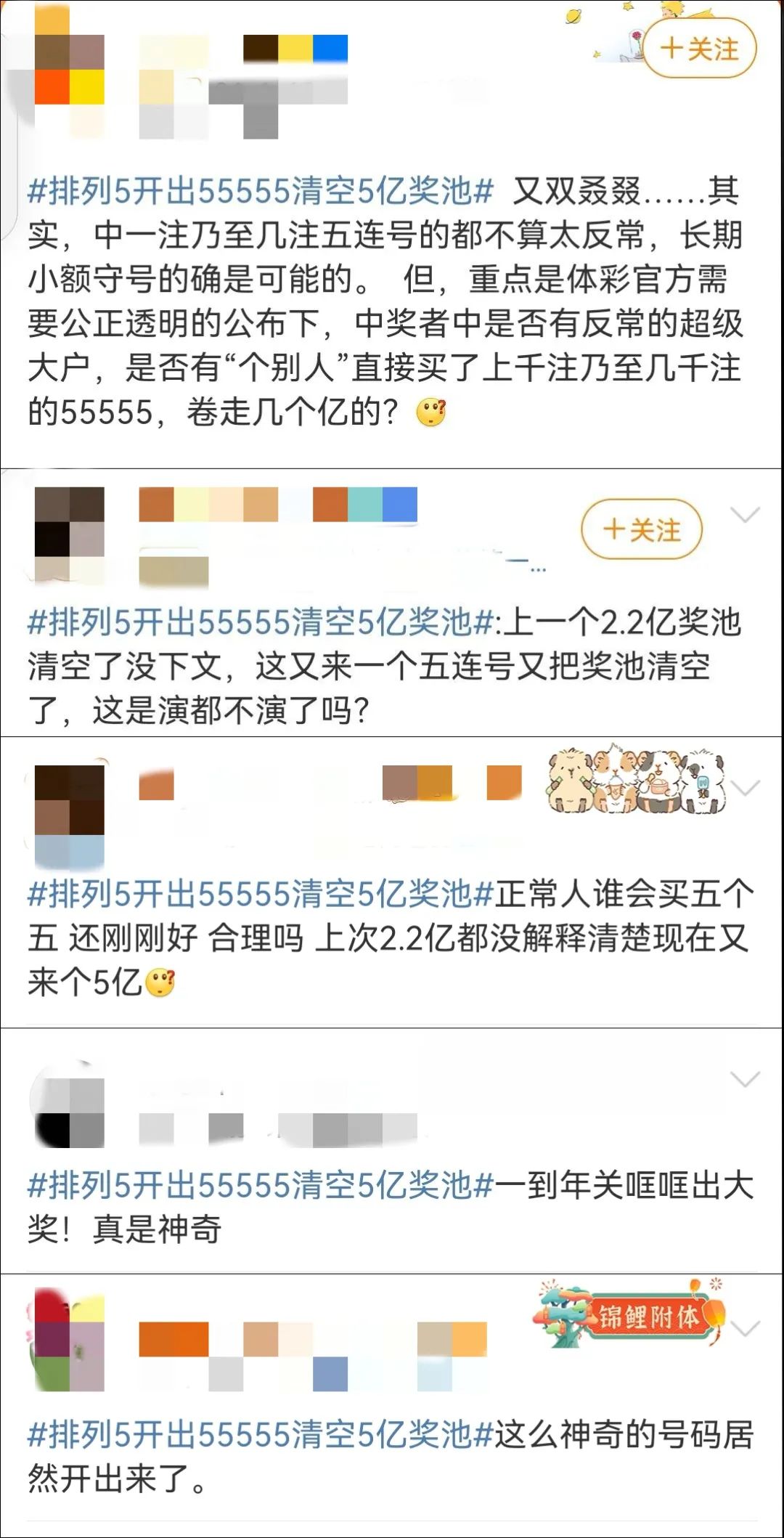 观察者网向上滑动看下一个原标题:《排列5开出"55555"清空5亿奖池,网友质疑》